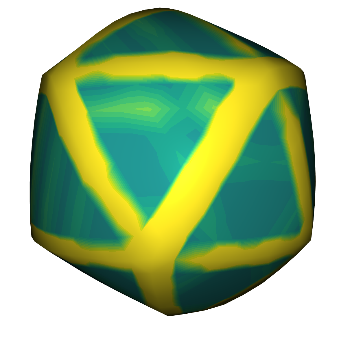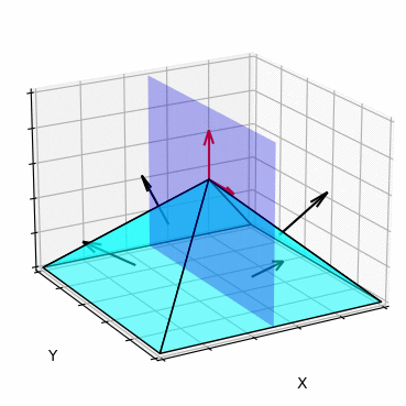 \(g\) is the preference function. It is modeled as a mixture of Gaussians. The preferences can be also defined face wise, which we will use later. \(g\) is defined as follows: $$ g(x) = \sum_k w_k \exp(\sigma x^T n_k) $$ \(n_k\) are the normal preferences and \(w_k\) are their weights. We always set the weights to 1, because we only have one preference per face. Therefore, they can be ignored. \(\sigma\) is a parameter that controls the width of the Gaussians. A high \(\sigma\) allows more deviation from the normal preferences. An example is shown on the right.
