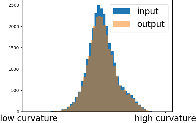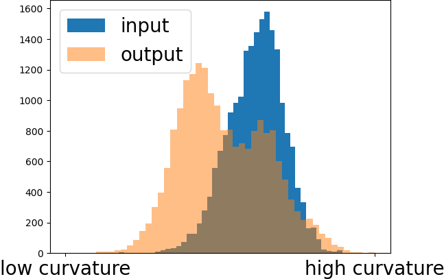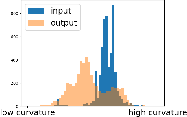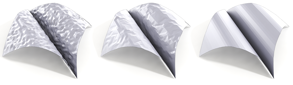 Increasing \(\sigma\) leads to clearer patches. If it is high, then the mesh deforms, which is visible on the right image. This is due to the fact that the width of the Gaussians is too large and therefore tolerates large deviations from the face normal preferences. While we double \(\sigma\) between the middle and the right image, the curvature in the histogram only changes slightly. Therefore, a value up to 20 leads to good results in this situation. From our experience we recommend setting \(\sigma\) to 4 or 10.