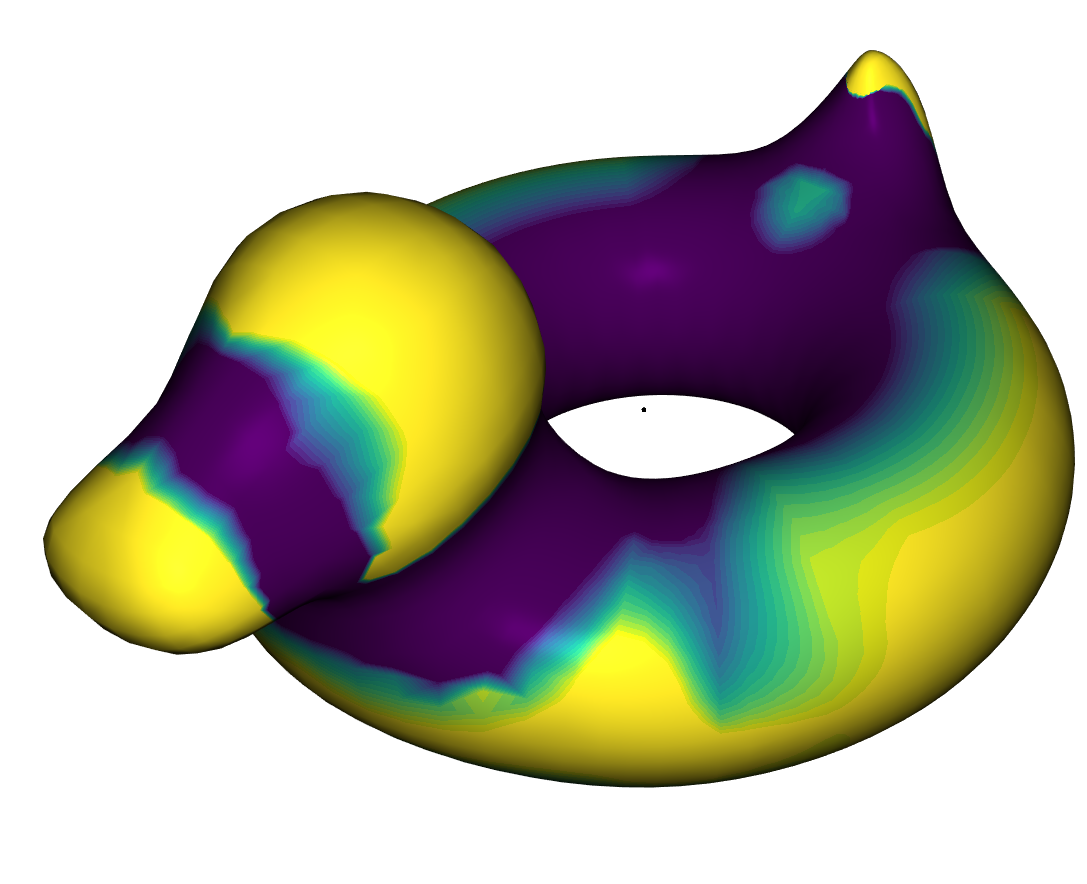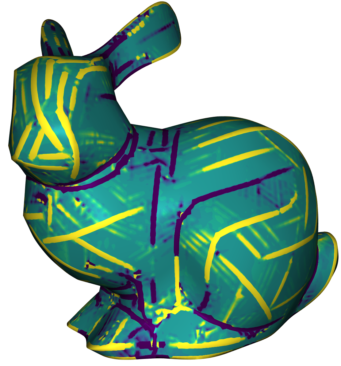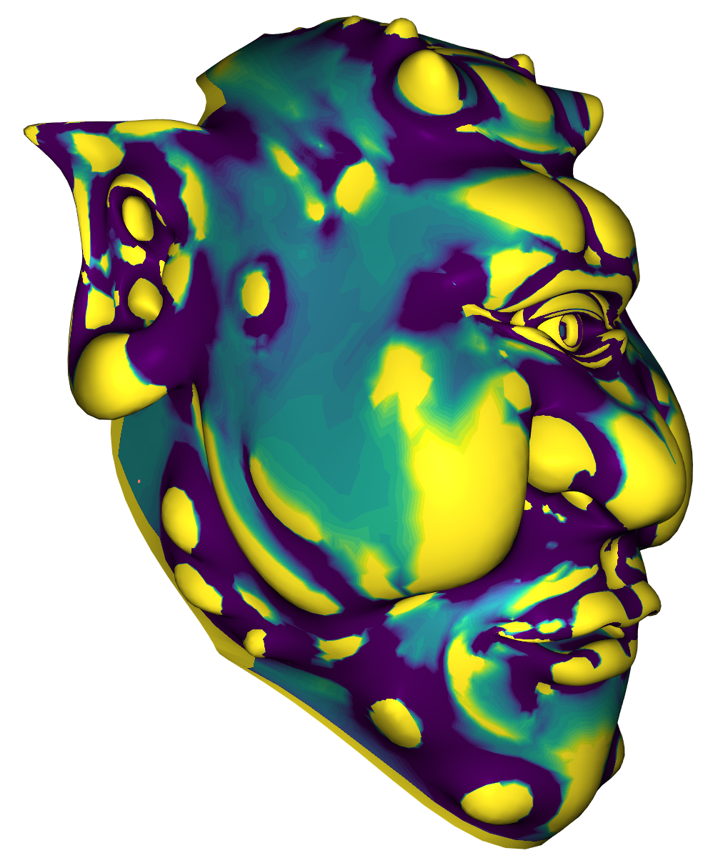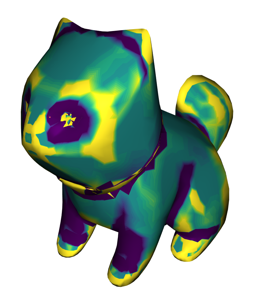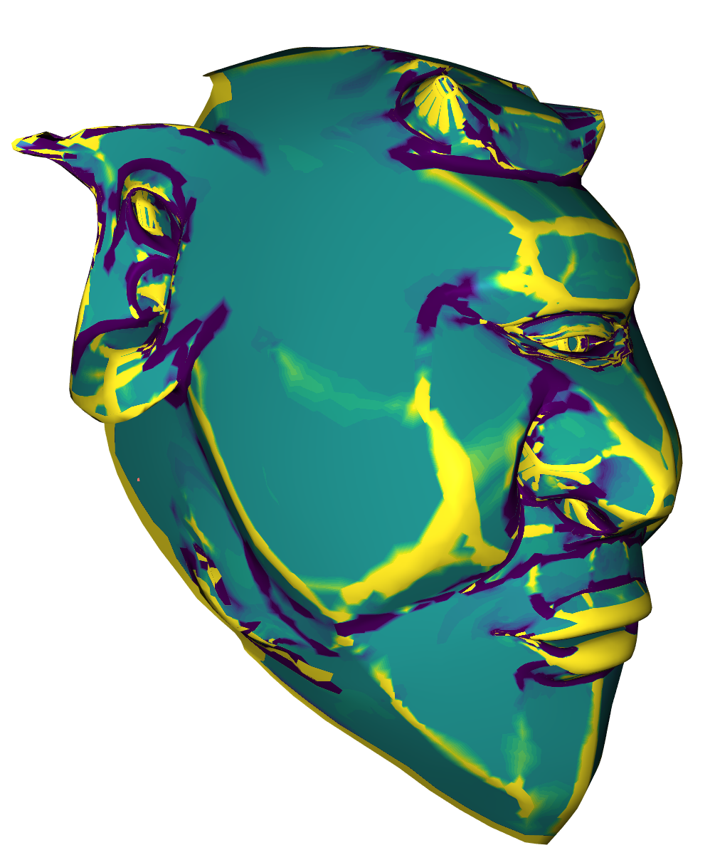 We used the Viridis color map to visualize the Gaussian Curvature on a surface. Blue means bent inward, turquoise means flat and yellow means bent outward. When the absolute of the curvature is higher than a given maximum \(\omega\), then we capped it at that value. This was useful to see more details. On all tests we applied \(1000\) iterations of the algorithm. The following images show the Gaussian Curvature of the original Stanford Bunny and the Gaussian Curvature of the approximated Stanford Bunny with \(\theta = 0.0025, \lambda=10^3, \sigma=10\) and \( \mu=1\). In the visualisation we set \(\omega=2^4\). Clicking on the images disables the curvature color map.