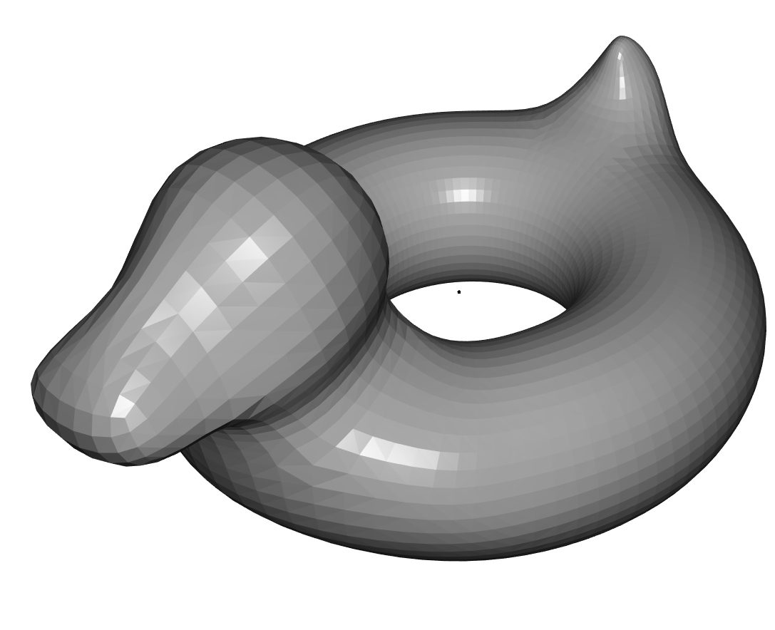 We use the Gaussian Curvature to measure the performance of the algorithm. The Gaussian Curvature is defined on a continous surface as the product of the two principle curvatures. On discrete surfaces it can be defined via the angle deficit and is then calculated as follows: $$k(v_i) = 2 \pi - \sum_{j \in N(i)} \theta_{ij}$$ Here \(N(i)\) are the adjacent triangles of the vertex \(v_i\) and \(\theta_{ij}\) is the angle at vertex \(i\) and triangle \(j\). In our implementation it is calculated according to the igl library which also normalised it over the area. For more details view [4].