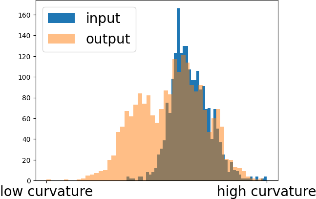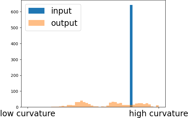 It is clear to see how \(\theta\) influences the generation of patches. When it decreases more crashes happen and therefore more and smaller patches are generated. On the left we never project the face normals onto the first two principle components and therefore we have only one preference normal around each vertex. This results in smoothing the mesh. Below the images we plotted a histogram with logarithmic scale of the Gaussian Curvature magnitude. It is clear to see that the curvature of most vertices decreases. This is due to the fact that it is more concentrated on the transition of the patches, while the patches itself are mainly flat. The spike blue on the left of the histograms is the curvature of the ground plane of the bunny, which is slightly changed during the optimization.
